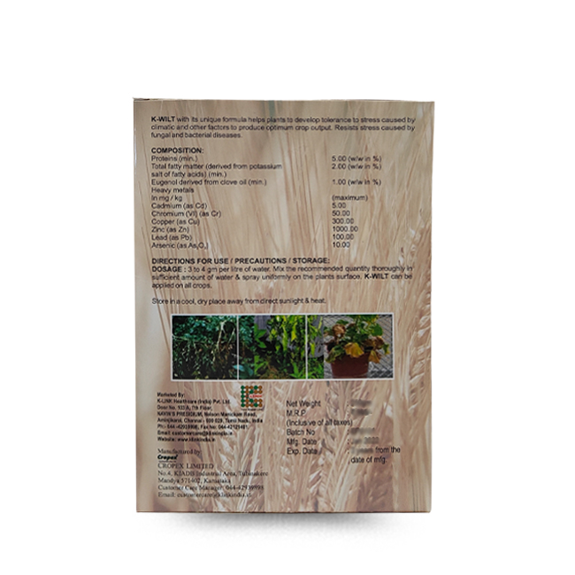 DOSAGE : 3 to 4 gm per litre of water. Mix the recommended quantity thoroughly in sufficient amount of water & spray uniformly on the plants surface. K-WILT can be applied on all crops.Total fatty matter (derived from potassium salt of fatty acids) (min.) 2.00 (w/w in %)